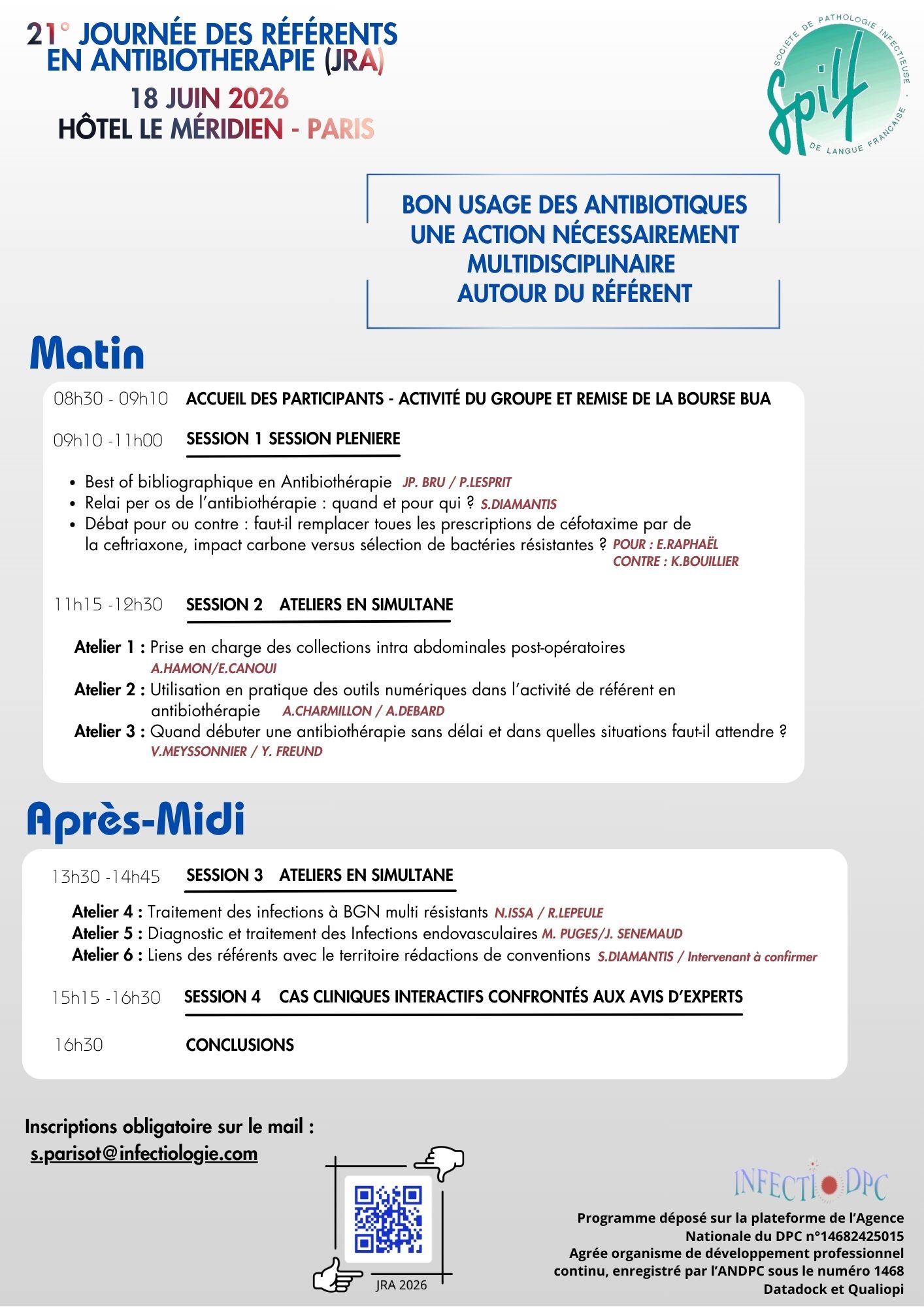 Bon Usage des Antibiotiques : une action nécessairement multidisciplinaire autour du référent « Du bon usage des outils diagnostiques en microbiologie pour endiguer l’antibiorésistance Cours d’automne 2026 » Inscription Mail : s.parisot@infectiologie.com Lien : inscription Ajouter au calendrier Google Agenda iCalendar Outlook 365 Outlook Live Détails Date : juin 18 Lieu PARIS France + Google Map